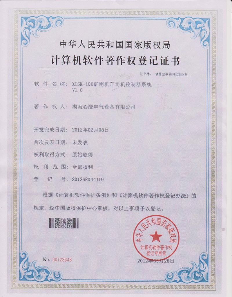 软件著作权(XCSK-100矿用机车司机控制器系统V1.0)